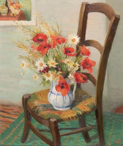 Nature morte au bouquet de fleurs sur une chaise