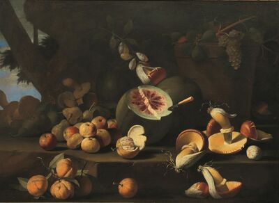 NATURA MORTA CON COCOMERI, PESCHE E FUNGHI