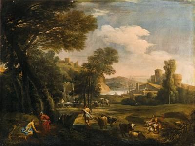 A landscape with hermits, shepherds, cattle and a washerwoman