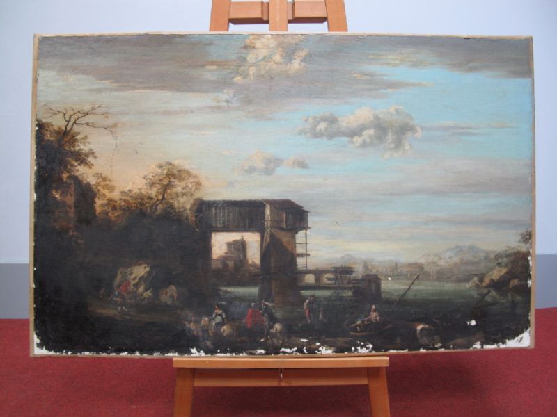 | A Coastal Landscape, with figures on horseback and boats in the foreground and a bridge under construction beyond | |