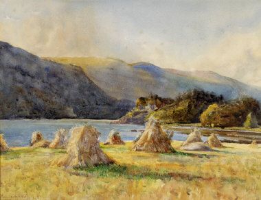 a highland landscape with corn stooks to the foreground