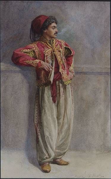 Full-length portrait of a Turkish man in national costume, standing leaning against a wall and smoking