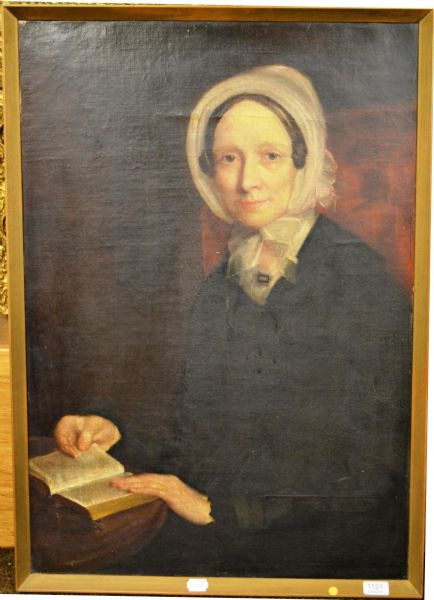 | A head and shoulders portrait of a lady wearing a white bonnet and black dress, seated reading a book | |