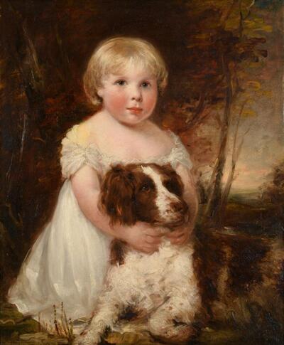 | Portrait of a young child kneeling in a wooded landscape holding a spaniel | |