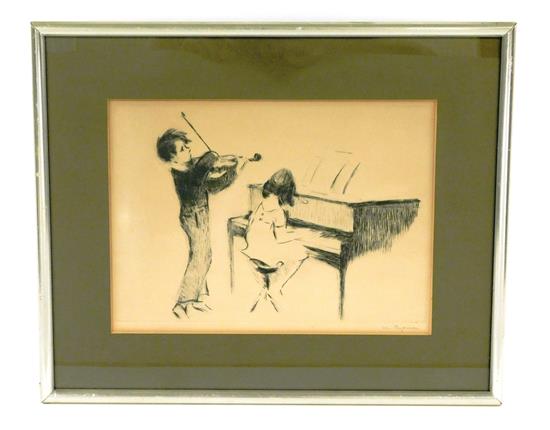| Depicts a musical duet, boy with violin, girl on piano | |