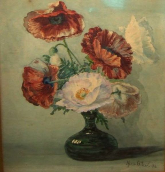 Still Life Study of Mixed Poppies in a Green Glass Vase