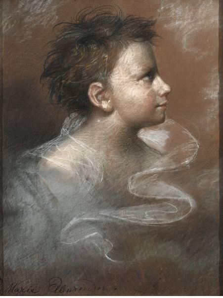 | Portrait eines Knaben im Profil von rechts. Schwarze, weiße und farbige Kreide | |