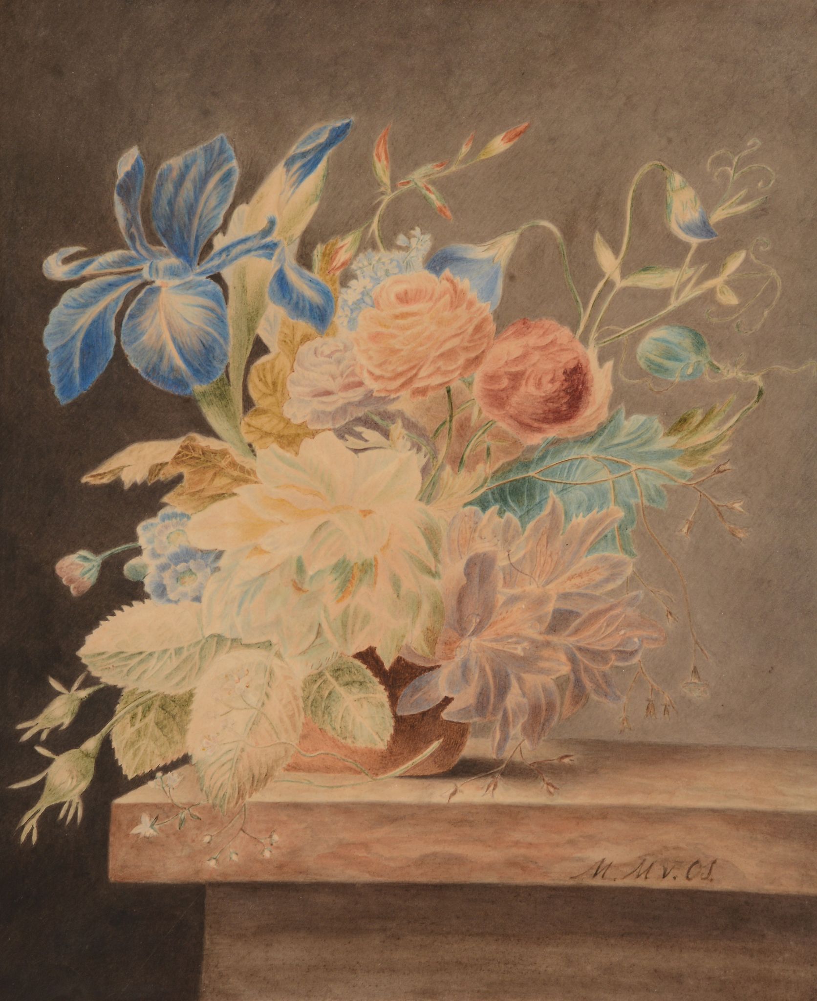 | A Vase of Flowers with a Blue Iris, Rose and Carnations on a Ledge | |
