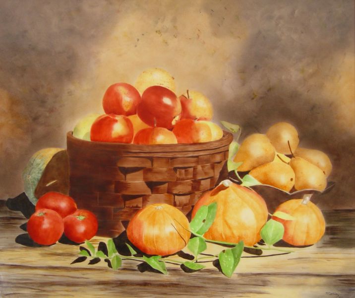 Still Life of Pears, Apples, Pumpkins and Tomatoes on Porcelain