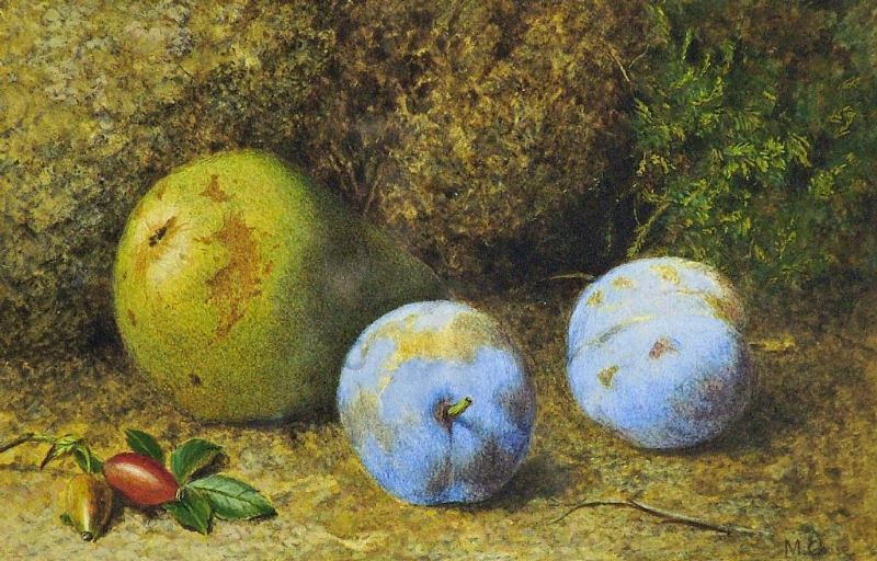Still life of two plums, a pear and rosehips