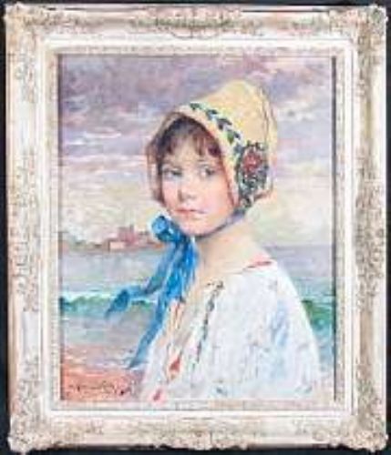 A portrait of a young girl in a bonnet at the seaside
