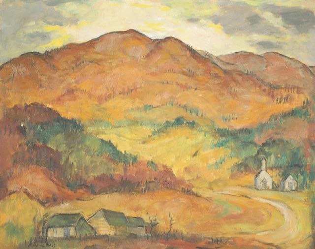 | Mountain landscape with farm and small church in fiery orange, yellows and greens. | |