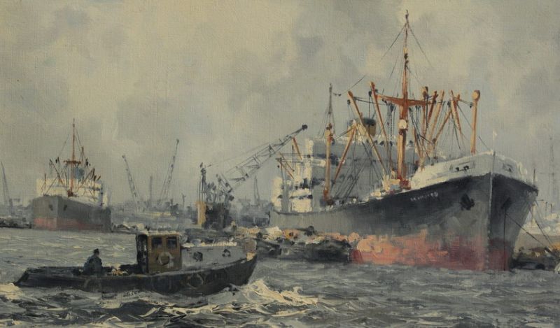 Busy Dutch Harbor Scene with Tankards & Tugboat