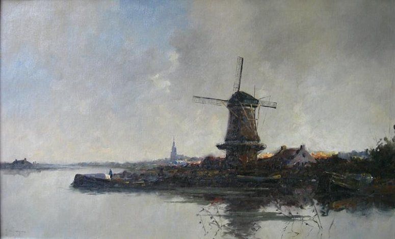 Landschap met molen en stadsverschiet