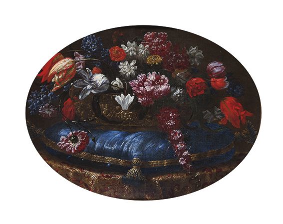| STILL LIFE WITH FLOWERS INA VASE ON A BLUE VELVET PILLOW | |