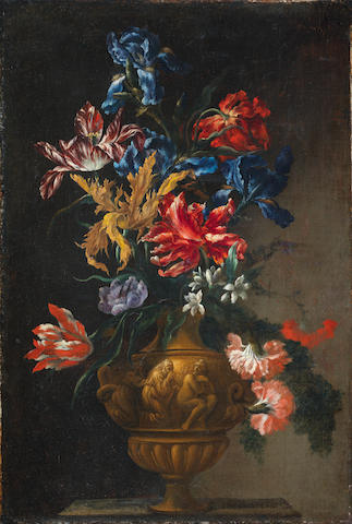 Tulips, irises, narcissi and other flowers in a bronze urn unframed