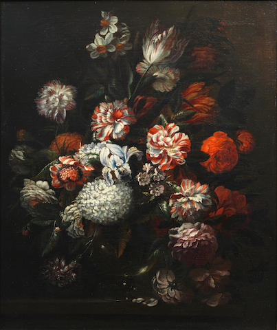 Tulips, roses, an iris and other flowers in a glass vase on a table-top