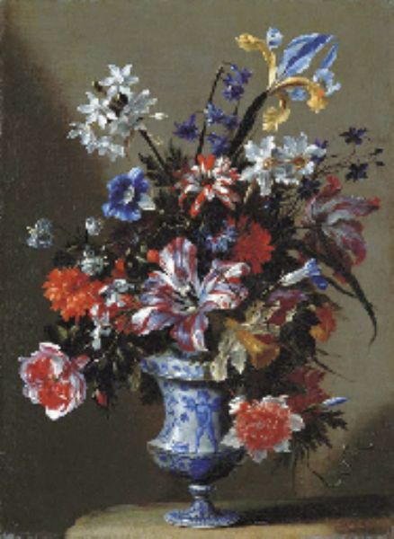 | Lilies, peonies, narcissi, morning glory and other flowers in a blue and white vase on a stone ledge | |