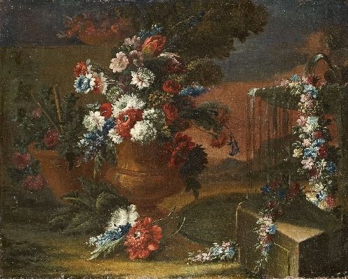 TWO FLOWER STILL LIFES WITH LANDSCAPE