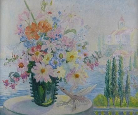 Summertime, study of a vase of flowers on a table with a lake and building in the distance