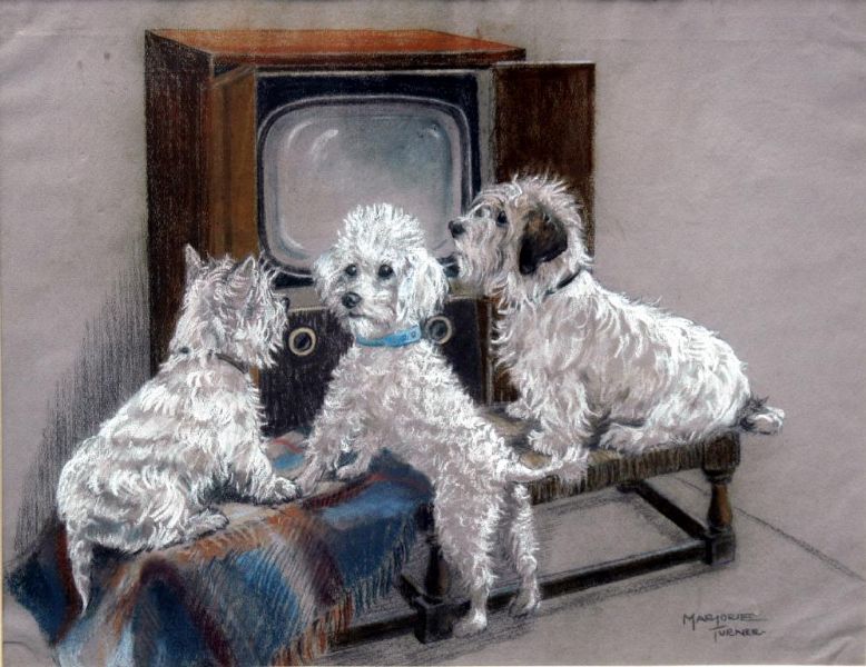 Three dogs watching television