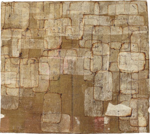 | Acrylic burnt paper collage on paper laid on canvas | |