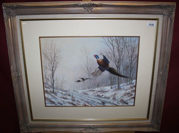 | snow-covered landscape with pheasants flying over a track | |