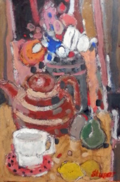Still life with teapot, vase of flowers and fruit