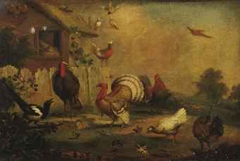 | Turkeys, a cockerel, hens and other fowl and birds by a hen-house | |