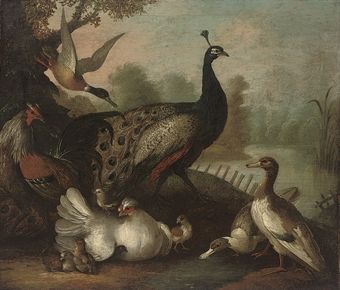 A peacock, ducks, fowl and other birds in a wooded river landscape