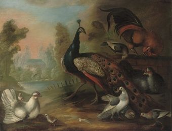 | A peacock, hens, fowl and other birds in a wooded river landscape | |