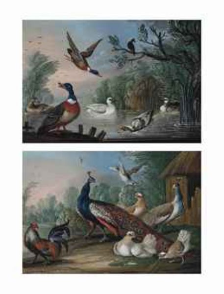 | Mallard, a swan and geese by a pond; and Peacocks and chickens beside a barn in a landscape | |