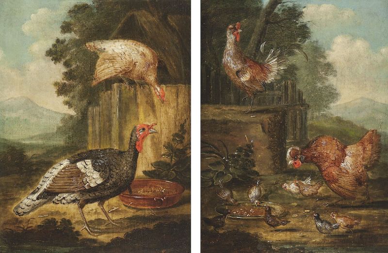 | Pair of landscape paintings with the depiction of a pair of turkeys and chickens with poults | |