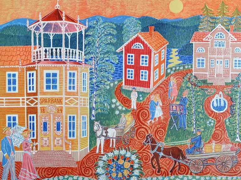 Byscen med folkliv och sparbank