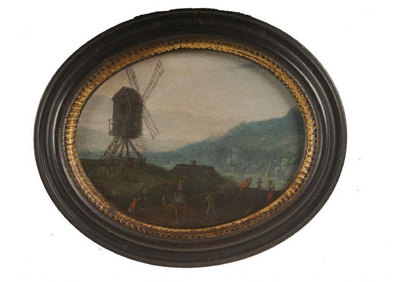 FIGURES AND HORSES ON A COUNTRY ROAD NEAR A WINDMILL