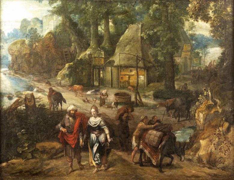 A HAMLET IN A WOODED CLEARING WITH JACOB AND RACHEL, OTHER FIGURES AND ANIMALS NEAR A WELL