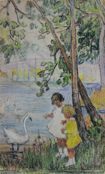 | CHILDREN FEEDING THE SWANS, BASS ROCKS, MA. WITH OVERHEAD TRESTLE IN BACKGROUND | |