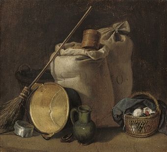 | Sacks of grain, a broom, an up-turned pot, a jug and a basket of yarn | |