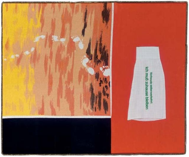 | Silkscreen ink on textile collage in printed and painted corrugated cardboard | |