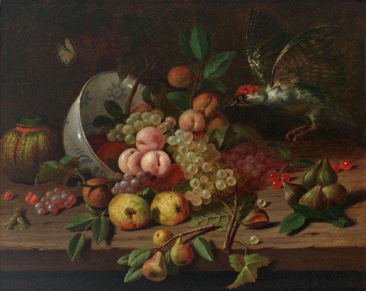 | Elegantes Früchtestilleben mit Pfirsichen, Trauben, Äpfeln, Birnen, Erdbeeren, Feigen, Kirschen, Kürbis und schräg gestellter De | |