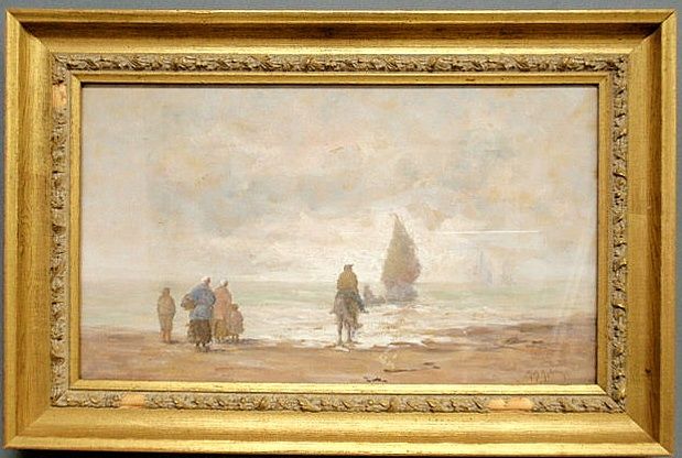beach landscape with figures on the beach and a sailboat coming ashore