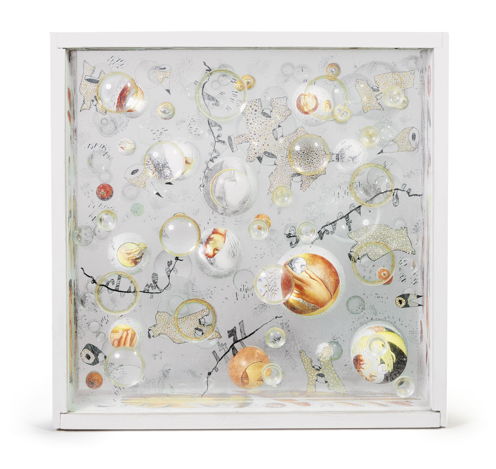 | Acrylic graphite, ink, lenses and wood in painted wood box construction with glass | |