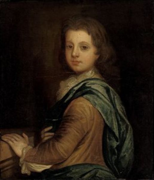 | Portrait of a young boy, half-length, in a brown coat and blue wrap, his left hand resting on a stone parapet | |