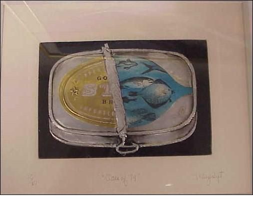 | sardine can with lid pulled back to reveal image of fish swimming | |
