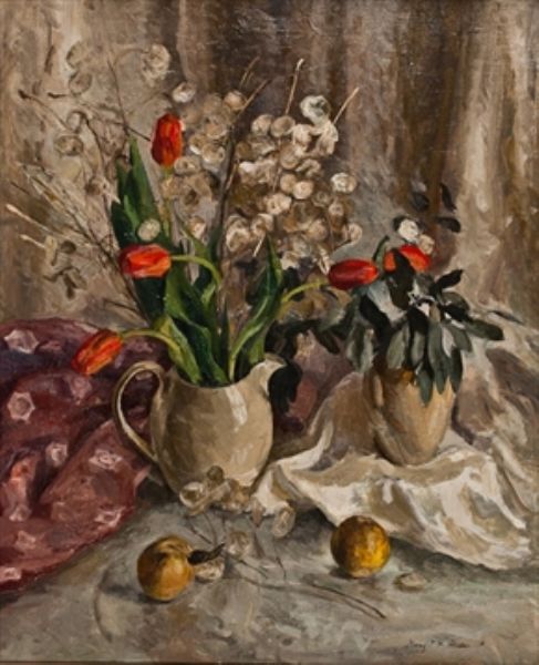 STILL LIFE WITH TULIPS, HONESTY & APPLES