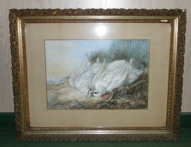A study of a dead cock and hen ptarmigan in winter white plumage in a landscape
