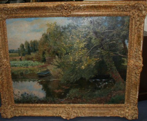 | Continental River Landscape with a Moored Boat, a Figure working in a Vegetable Garden beyond | |