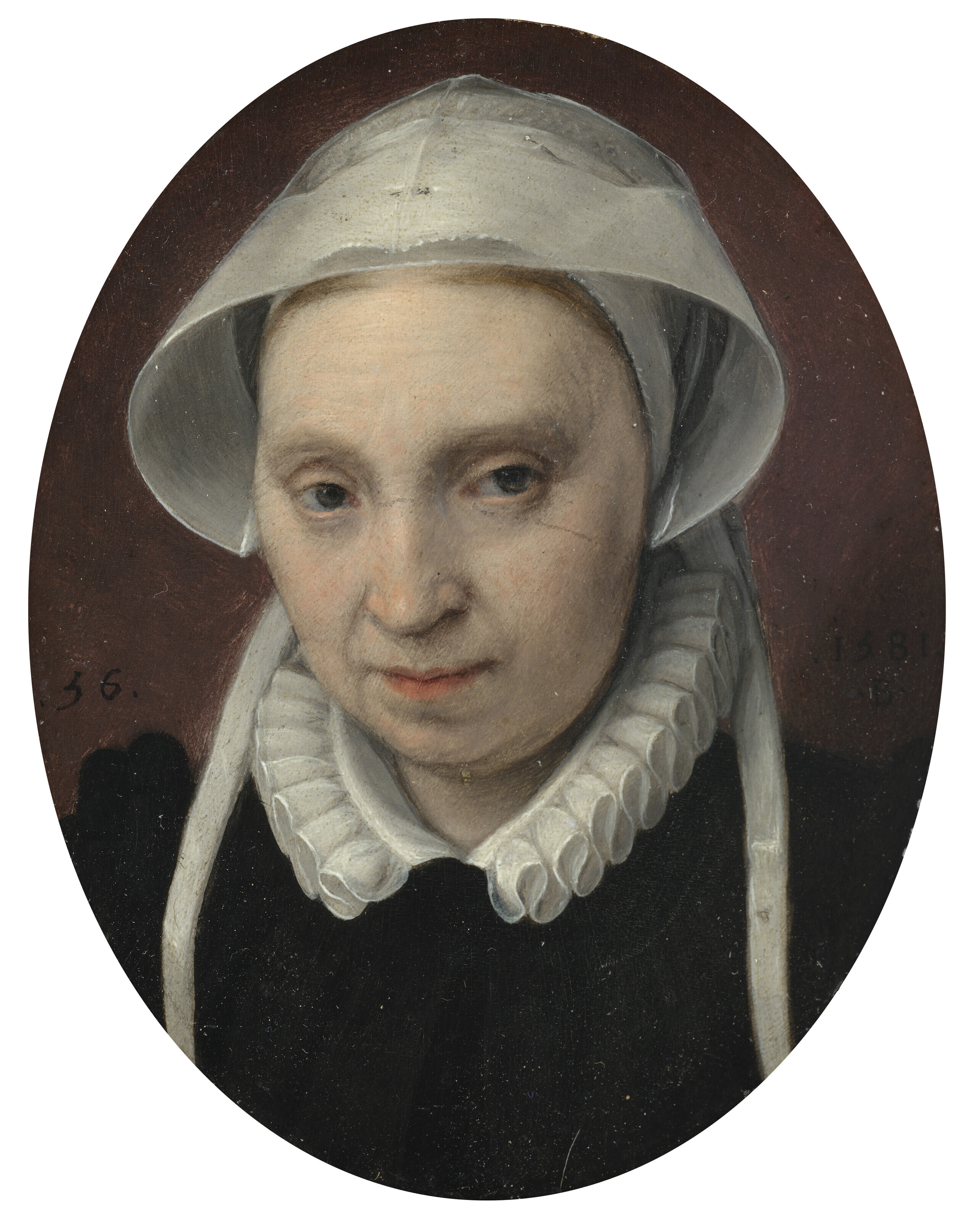 | Portrait of a lady bust-length in a black dress wearing a wing cap with starched tails and a white ruff | |
