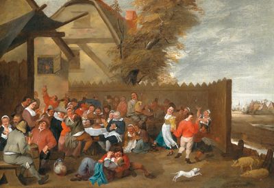 Peasants celebrating by a tavern