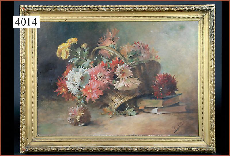 Blumenstillleben mit Astern, Weidekorb und Büchern